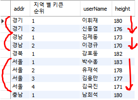 OVER(PARTITION BY addr ORDER BY height DESC, userName ASC) "지역 별 키큰 순위", userName, height