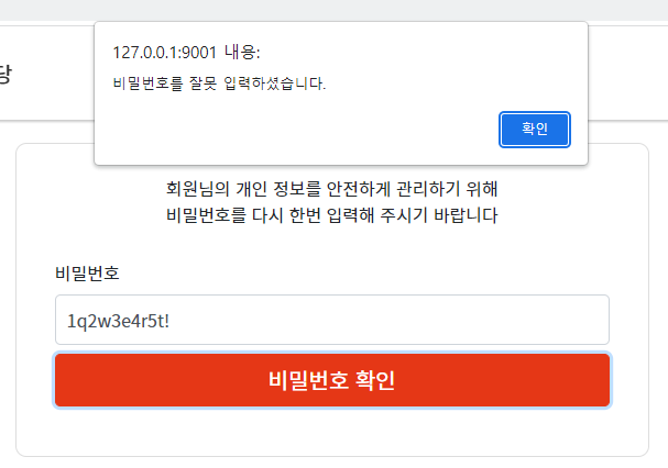 1q2w3e4r5t! 가 일치하지 않다는 것을 확인