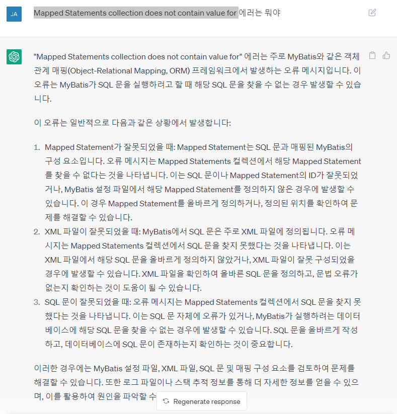 위 에러는 오타 혹은 매핑된 mybatis누락 등이 있다.