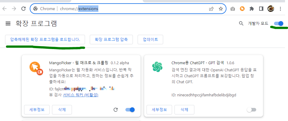 - 개발자도구를 사용하여 압축해제된 확장프로그램 로드 클릭