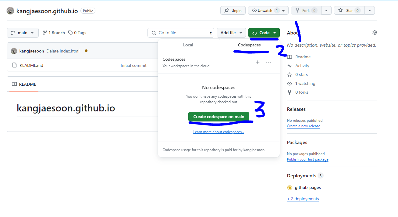 2. 만들어진 repository 확인 및 코드스페이스 접속