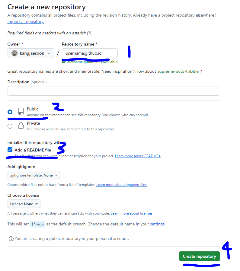 리파지토리이름은 username.github.io형태로 작성한다 내 계정 기준이면 kangjaesoon.github.io가 된다